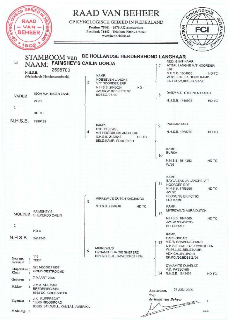Dutch Pedigree Faimshey's Cailin Donja